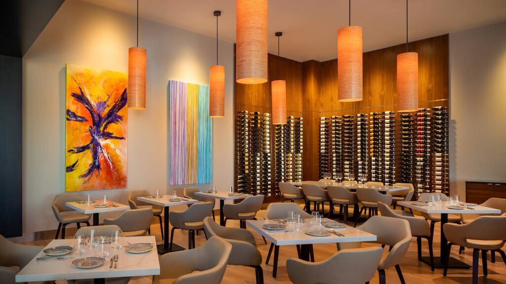 The contemporary design incorporates sleek furnishings metals finishes customized lighting installations. Local artworks adorn the walls creating visual interest throughout the space. The restaurant’s modern amenities include: